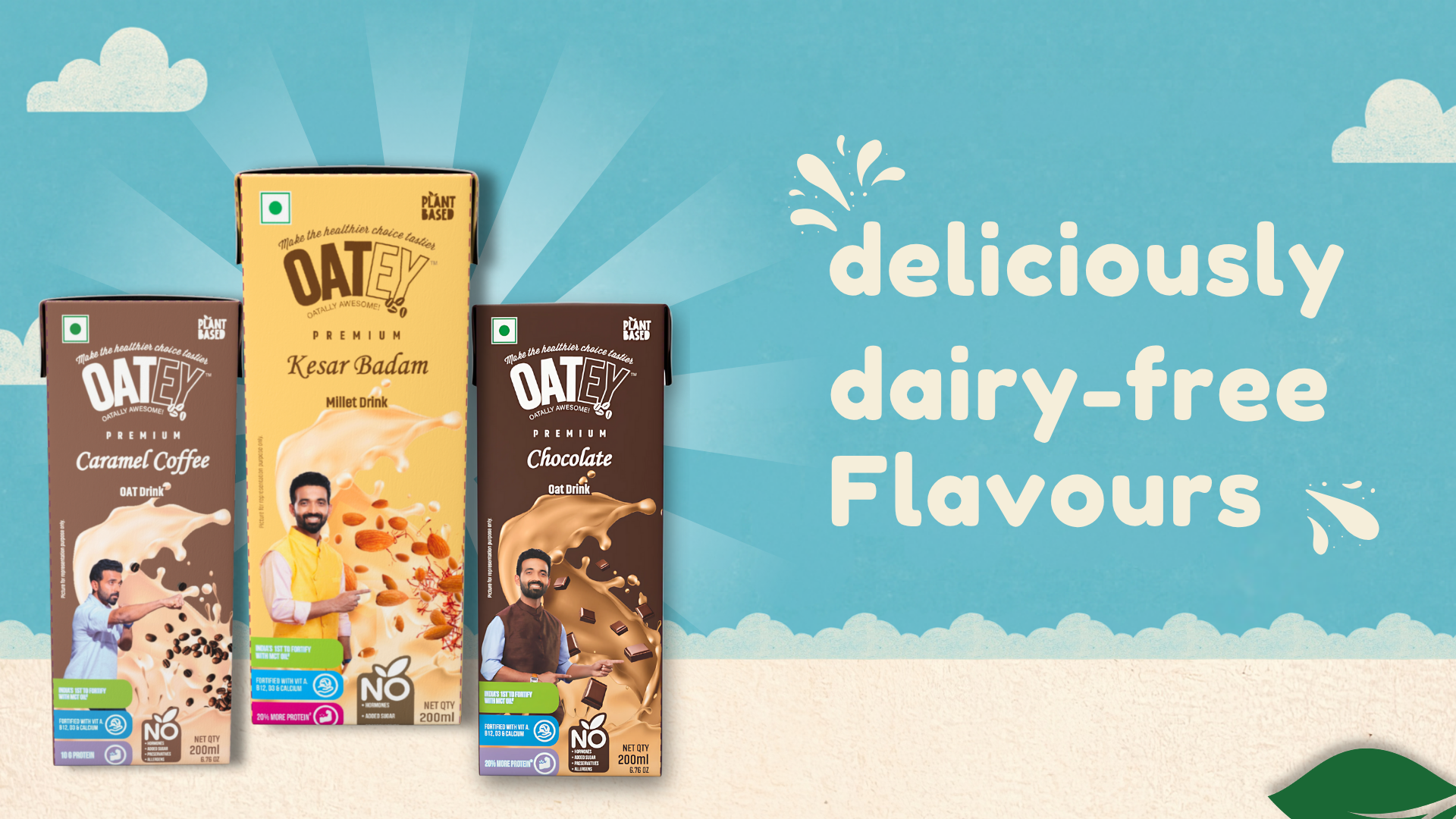 Oatey offers Caramel Coffee Oat Drink, Barista Oat Milk, Chocolate Oat Milk, Kesar Badam Millet Milk, and Assorted Packs.